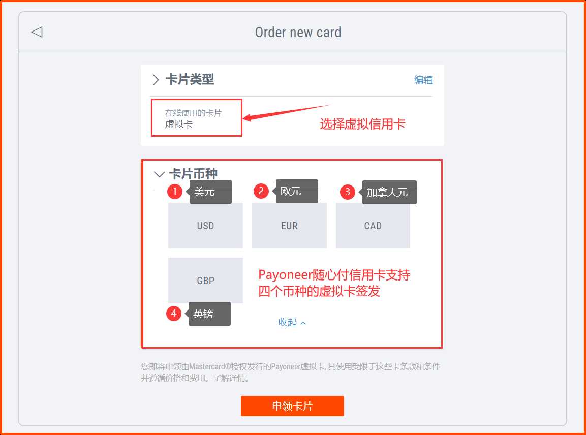 截止到2022年3月底, Payoneer随心付虚拟信用卡支持USD美元、EUR欧元、GBP英镑、CAD加拿大元等四个币种的卡片开通。