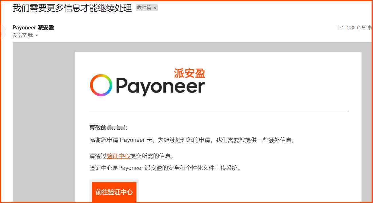 此时, 您的Payoneer注册邮箱会收到正在审核开通的邮件, 同时开通随心付虚拟卡需要进行地址验证, 点击邮件中的 验证中心 按钮, 跳转到Payoneer账户后台验证中心, 提交地址证明。