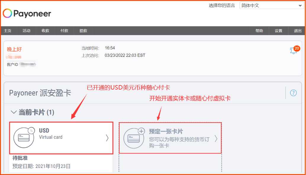 第一步、登录Payoneer后台 - 选择开通随心付虚拟卡