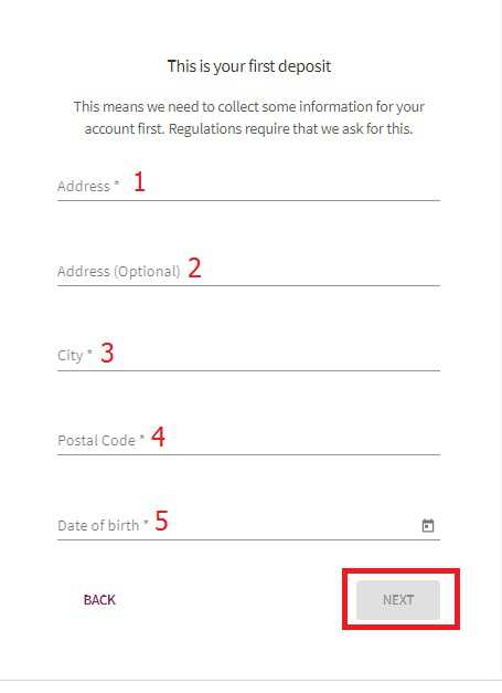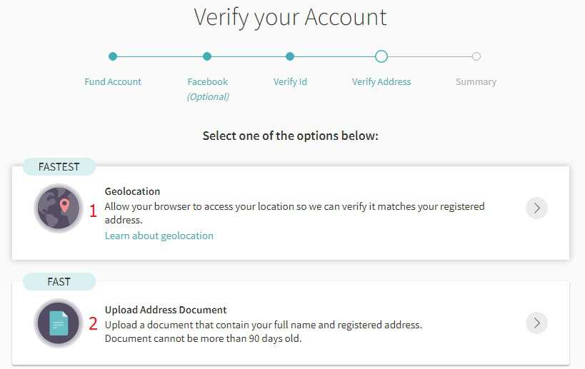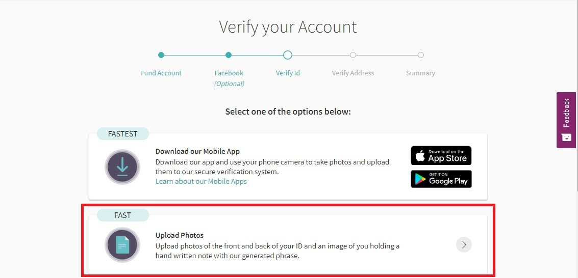 (1)存款-(2)链接到Facebook帐户(可选)-(3)识别ID-(4)验证地址。