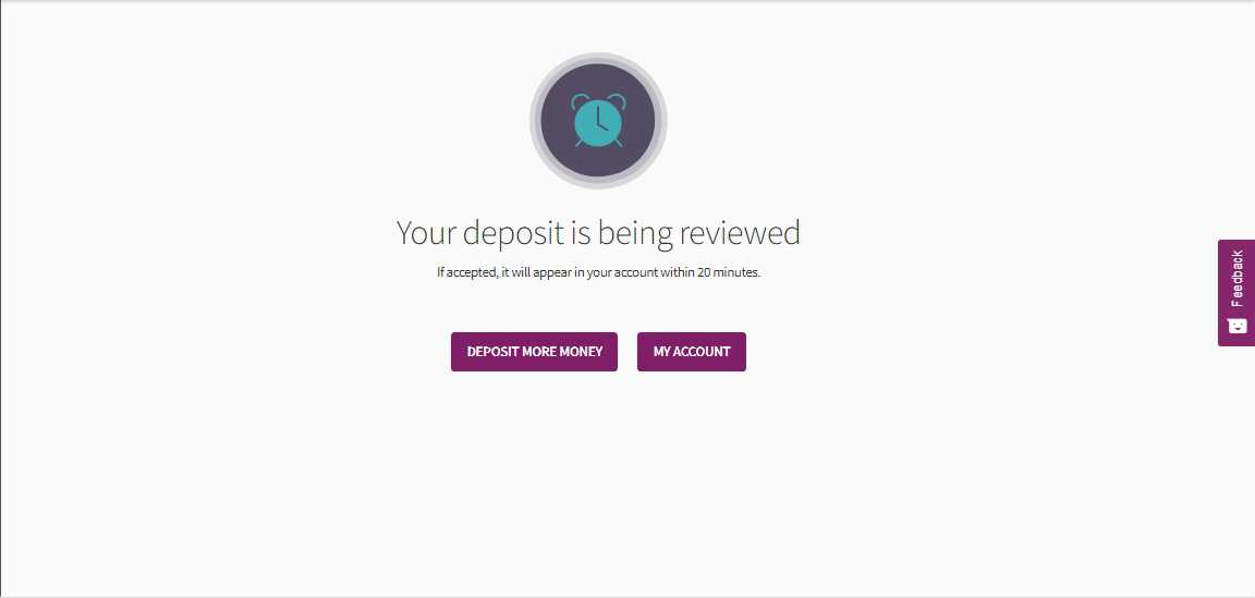 完成后,Skrill将显示您已存入的确认。在20分钟内,这笔钱将转入您的帐户。