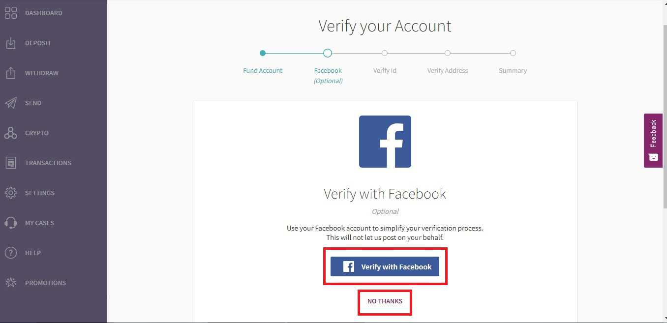 步骤2:Skrill会询问您是否要链接到您的Facebook帐户。如果您同意,请选择“通过Facebook验证”。如果没有,请选择“不,谢谢”。在这里,我选择不,谢谢。