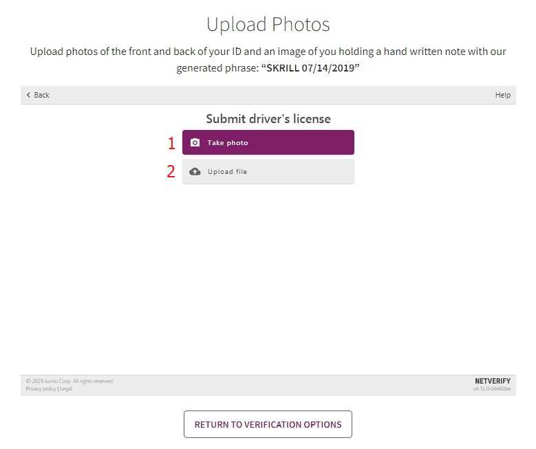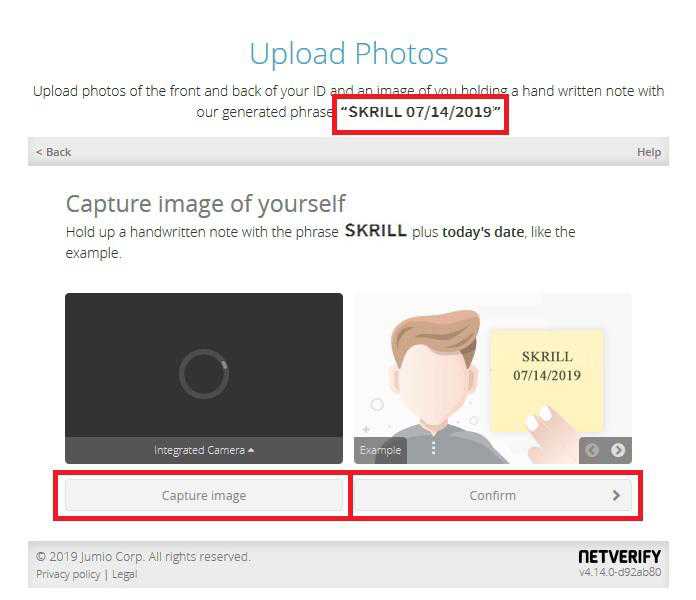第7步:使用写有SKRILL +今天的月/日/年的论文拍摄/上传自拍图像。您的脸需要在照片中清晰可见。完成后,按确认。