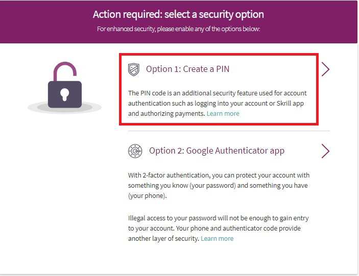 同样在下次登录时,Skrill会要求您创建一个6位数的PIN码以保护您的帐户并在交易时使用它。单击选项1。然后输入6位数的PIN码。确保仔细保存此代码,以用于后续交易。