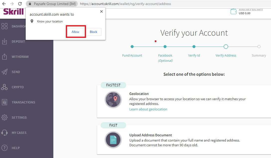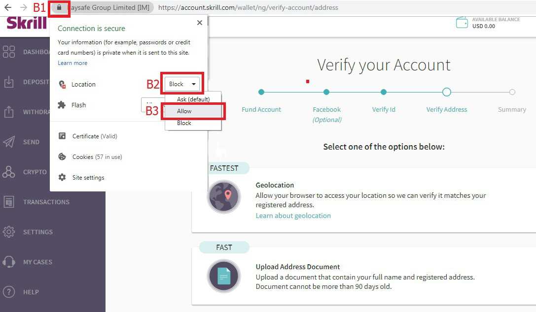 (1)地理位置:打开浏览器的位置,以便Skrill在Google Map上自动找到您的位置。非常快。但是您必须在注册帐户的地址附近使用计算机/笔记本电脑。